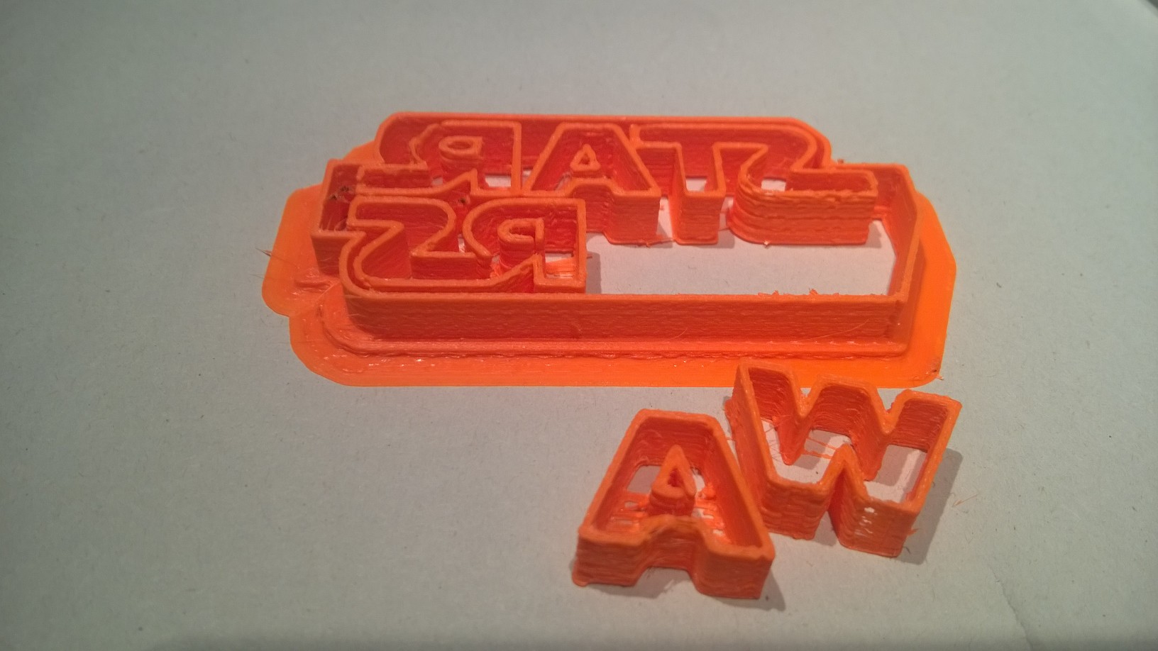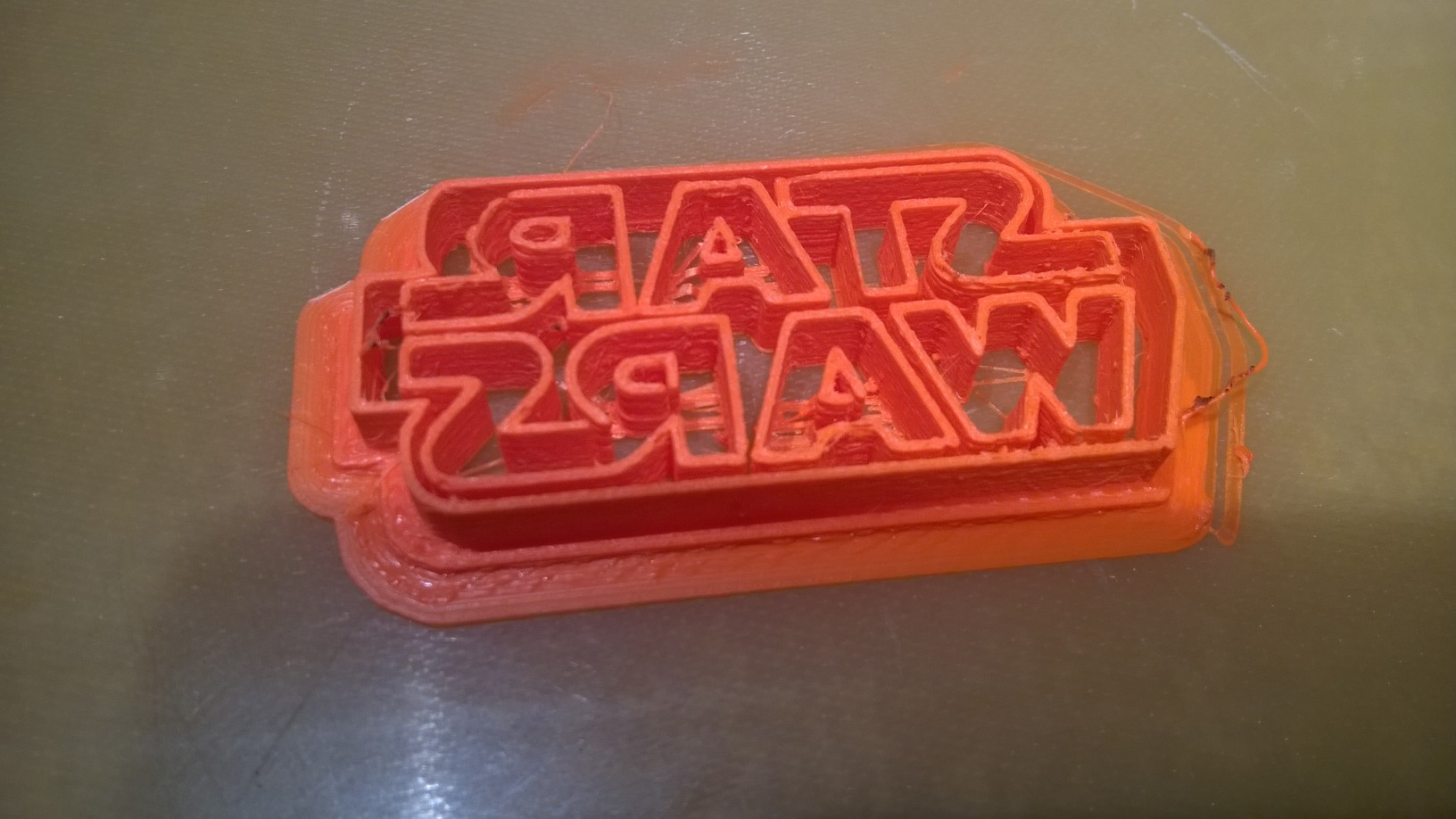 Dieses Mal mit einem Foto direkt vom Druckbett. Leider war die *.stl-Datei nicht so gut wie erhofft. Denn das Problem ist, dass die Buchstaben nicht alle zusammenhängen (siehe unten).