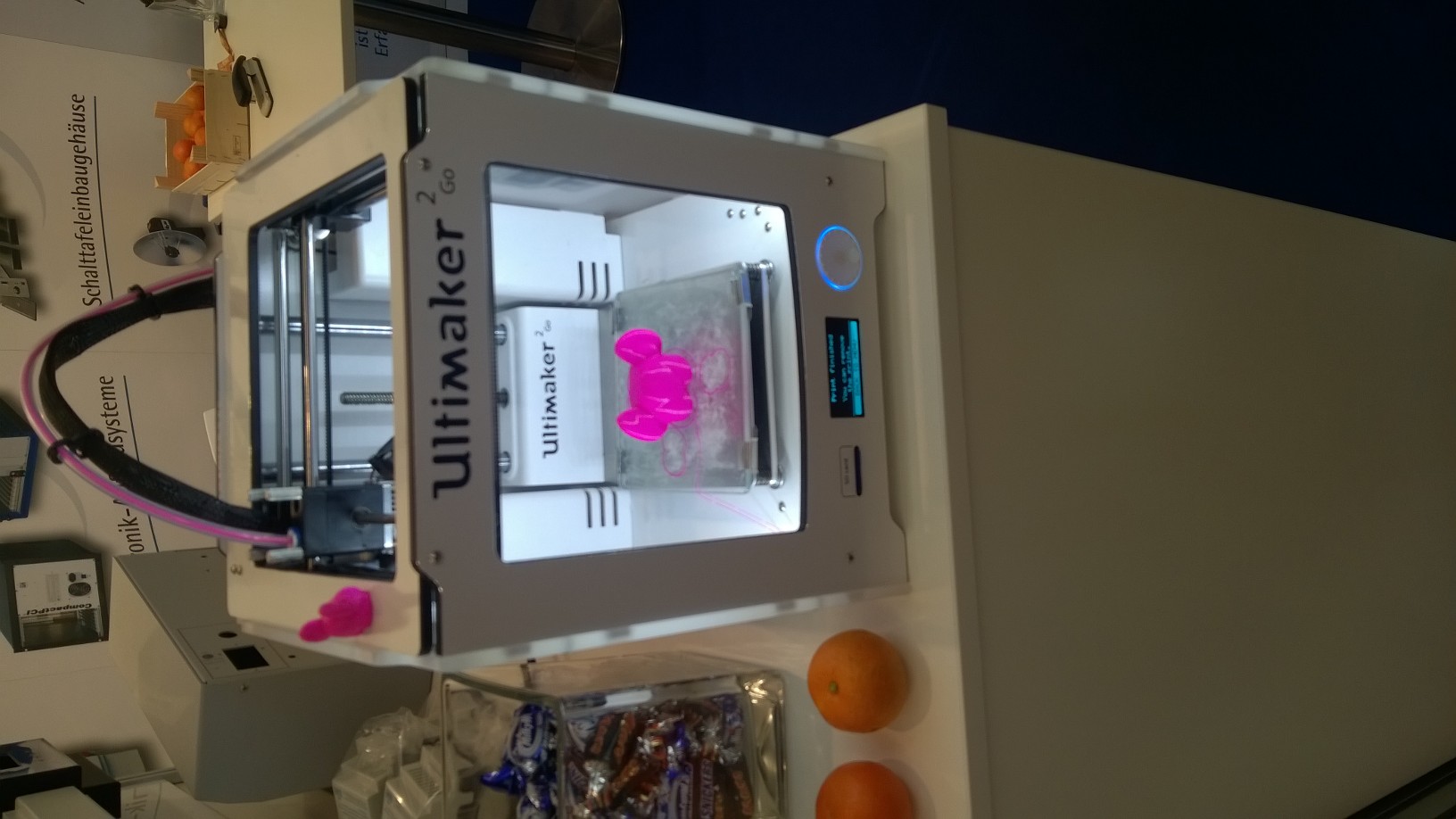 An einem andern Stand stand ein Ultimaker 2 Go. Um Aufmerksamkeit zu erregen wurde dort ein „Arsch mit Ohren“ gedruckt.