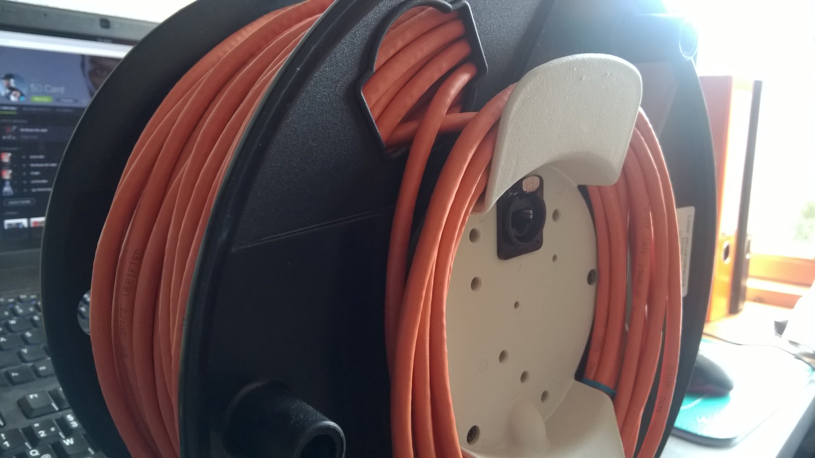 Dafür habe ich bei Amazon eine leere Kabeltrommel und eine RJ45 Einbaubuchse von Neutrik bestellt. Alles zusammen sieht dann so aus: